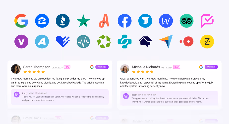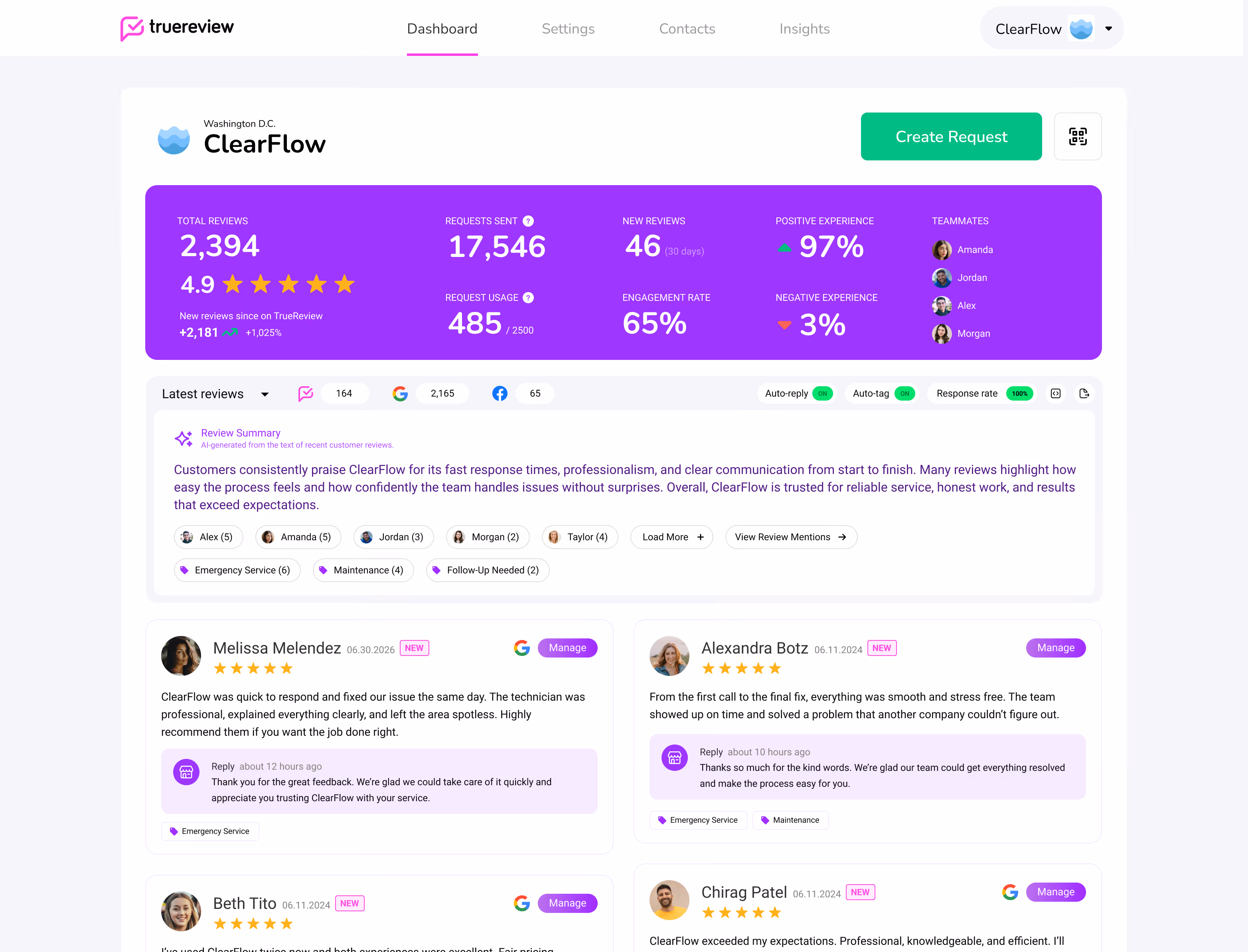 Manage reviews from Google, Facebook, TrueReview and more from your dashboard.