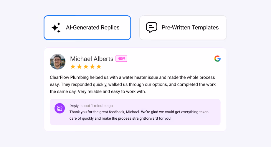 Schedule automatic replies to new Google and TrueReview reviews as soon as your customers post them, using AI-generated or template-based responses.