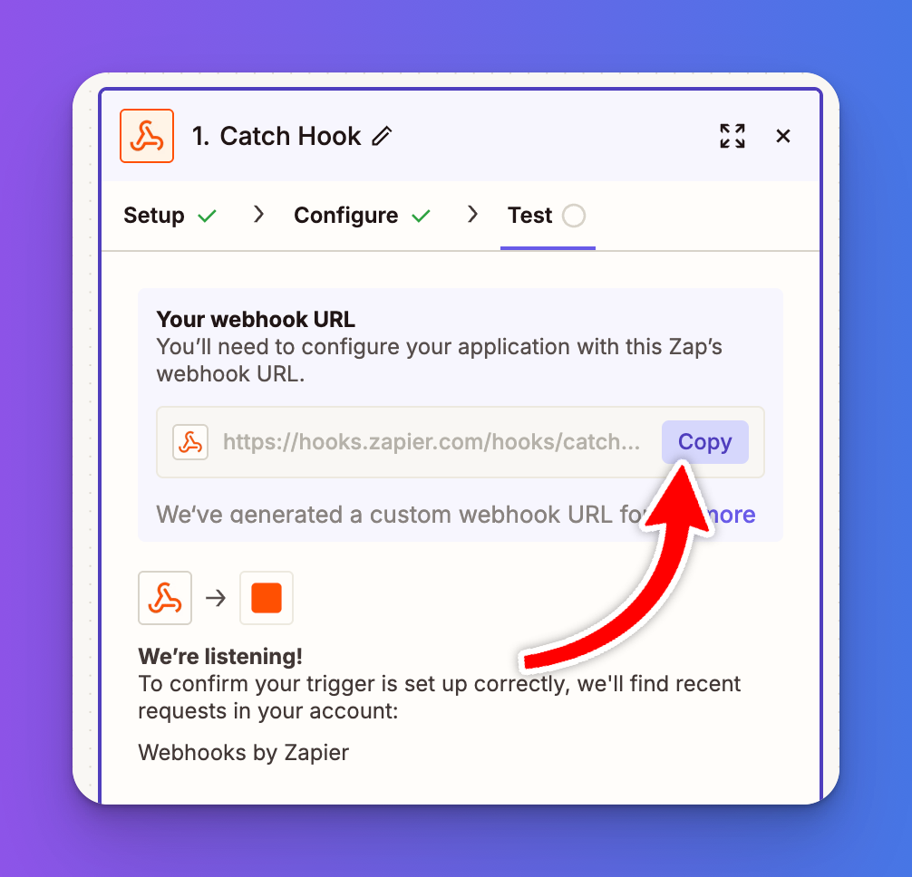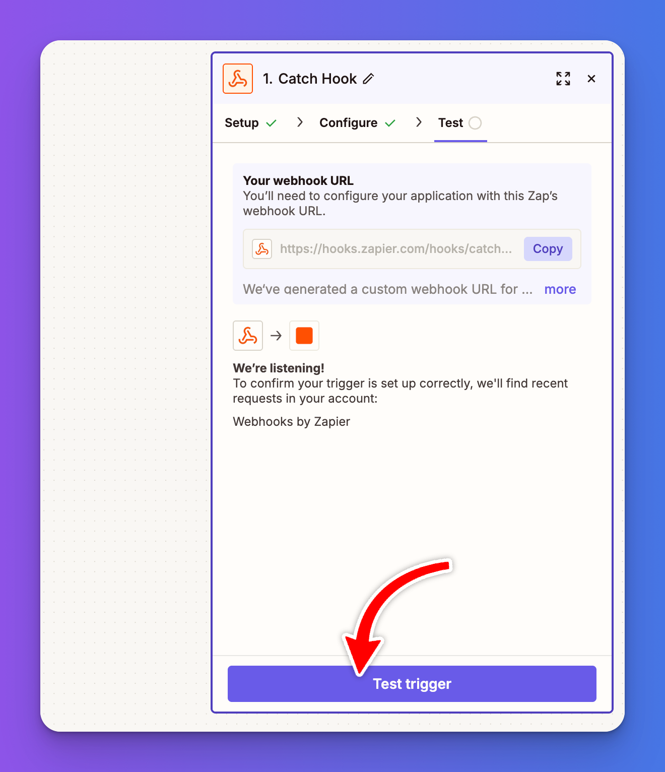Head back to the Zapier Catch Hook step, and click Test Trigger